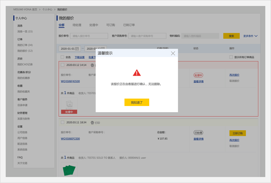 【处理中】的商品,点击【如何取消报价单】,页面跳转到弹窗。
