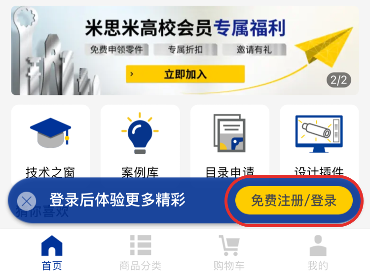 1.点击米思米首页【免费注册/登录】